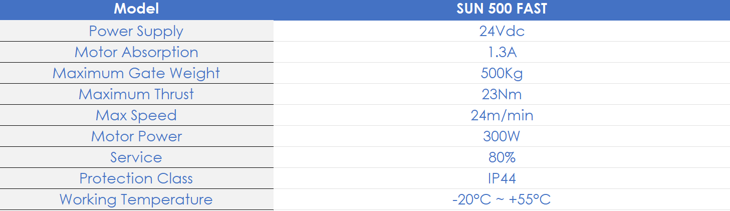 The KEY Sun 500 Fast is our DC motor range which offers speeds up to 40 cm/sec with extremely silent mechanics, protected by robust die-cast and powder-coated aluminum body.