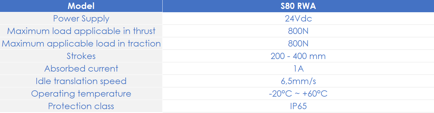 The S80 RWA is a Linear electric actuator for skylights, louvres, casement windows etc. IP65 protection degree. CE marked device, tested in accordance with the EN12101-2 Standard for smoke ventilation applications.